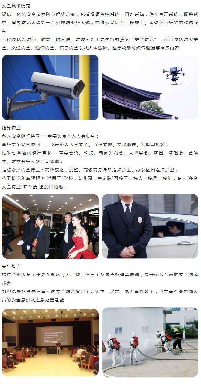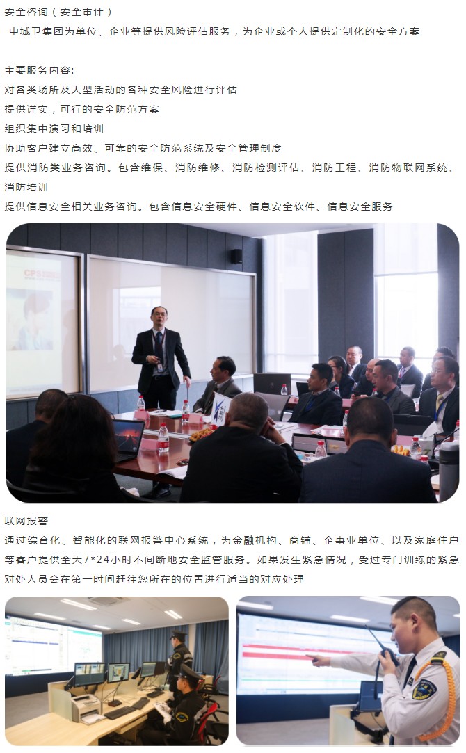 中城衛保安集團是中國國內覆蓋范圍廣泛、服務高端客戶眾多的全牌照大型民營安全管理集團。集團自成立以來,以“服務社會、造福民生”為使命,以“成為具有世界影響力的整體安全服務提供商”為愿景,以“理想、忠誠、專業、效率”為企業精神,以“技術創新、管理創新、商業模式創新”為發展手段,借助資本的力量,通過十多年的努力,已經躋身成為中國領先的整體安全服務提供商。在中國推進國家治理體系和治理能力現代化的背景下,中城衛保安集團積極配合政府進行社會治安綜合治理創新,為平安中國建設添磚加瓦。另外,隨著中國的國際社會地位和國家影響力的不斷上升,以及在“一帶一路”倡議的大背景下,中城衛保安集團有志于在國際舞臺上做出應有的貢獻。